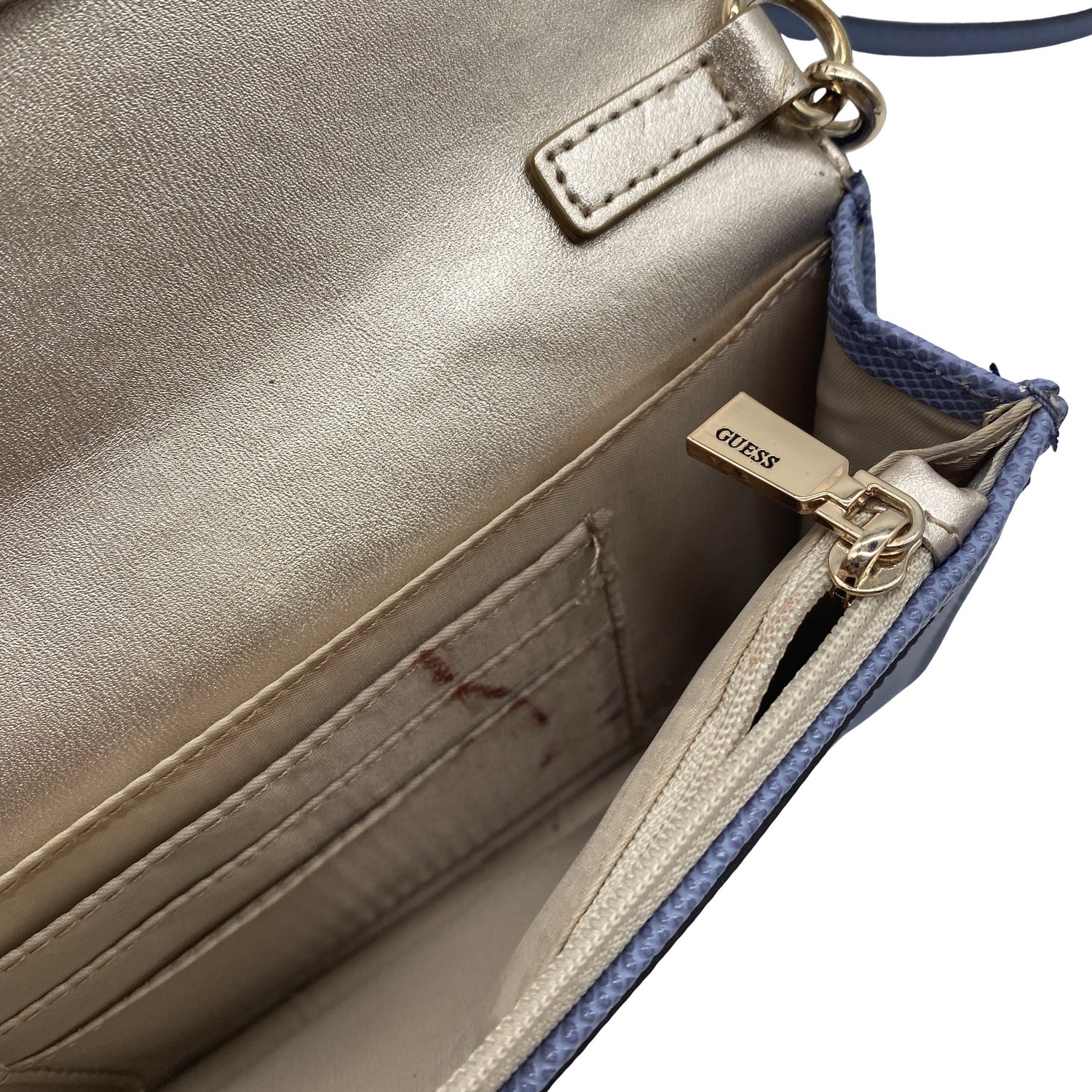 Crossbody. Olkahihnan pituus on säädettävissä. Tuotteen sisäpuolella on muutama haalea tahra. Tuote on muilta osin hyvässä kunnossa.