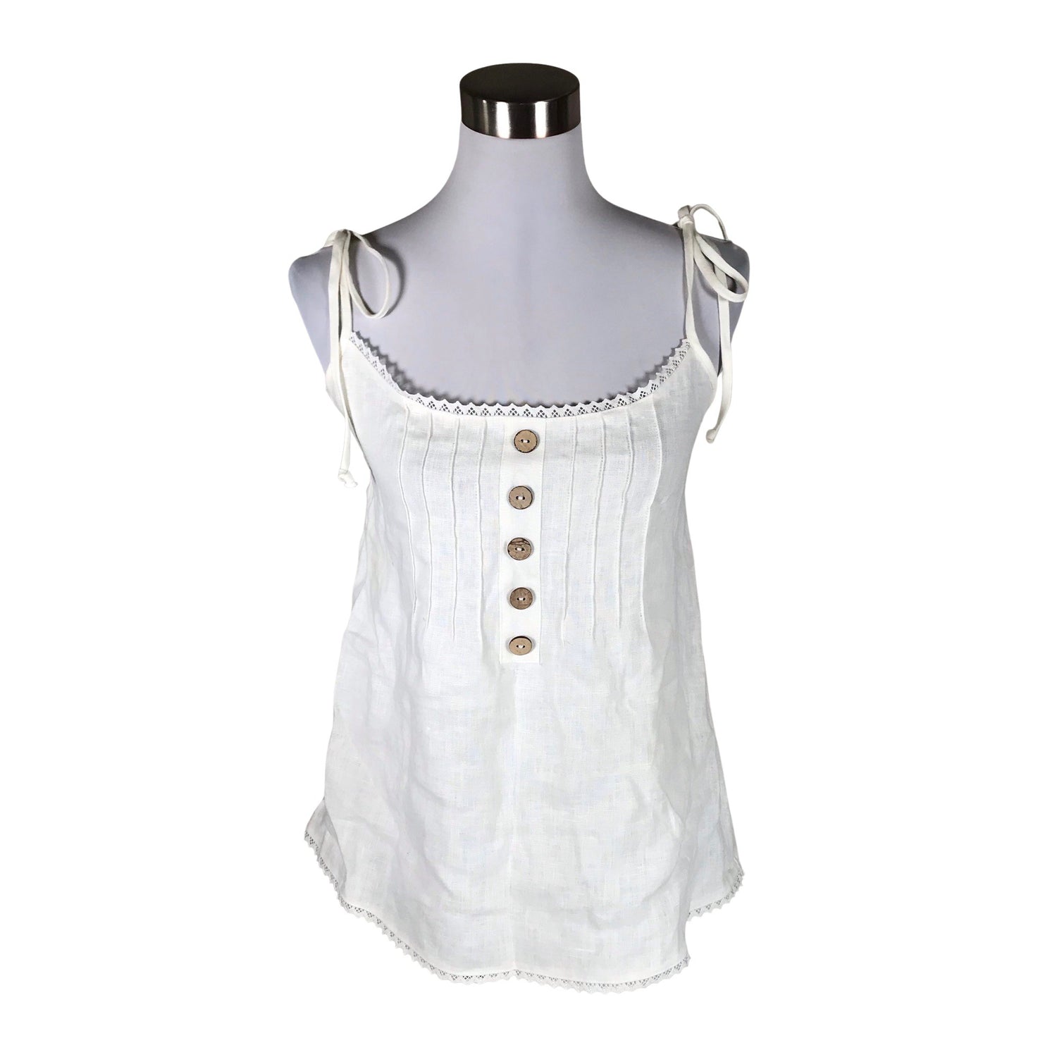 Säädettävät olkaimet. Tuotteessa on joustava kuminauharypytys. Pellavaa. Tuotteessa on pitsisomiste. Tuotteen pinnassa on aavistus pesu-/käyttökulumaa. Yleisilme on siisti.