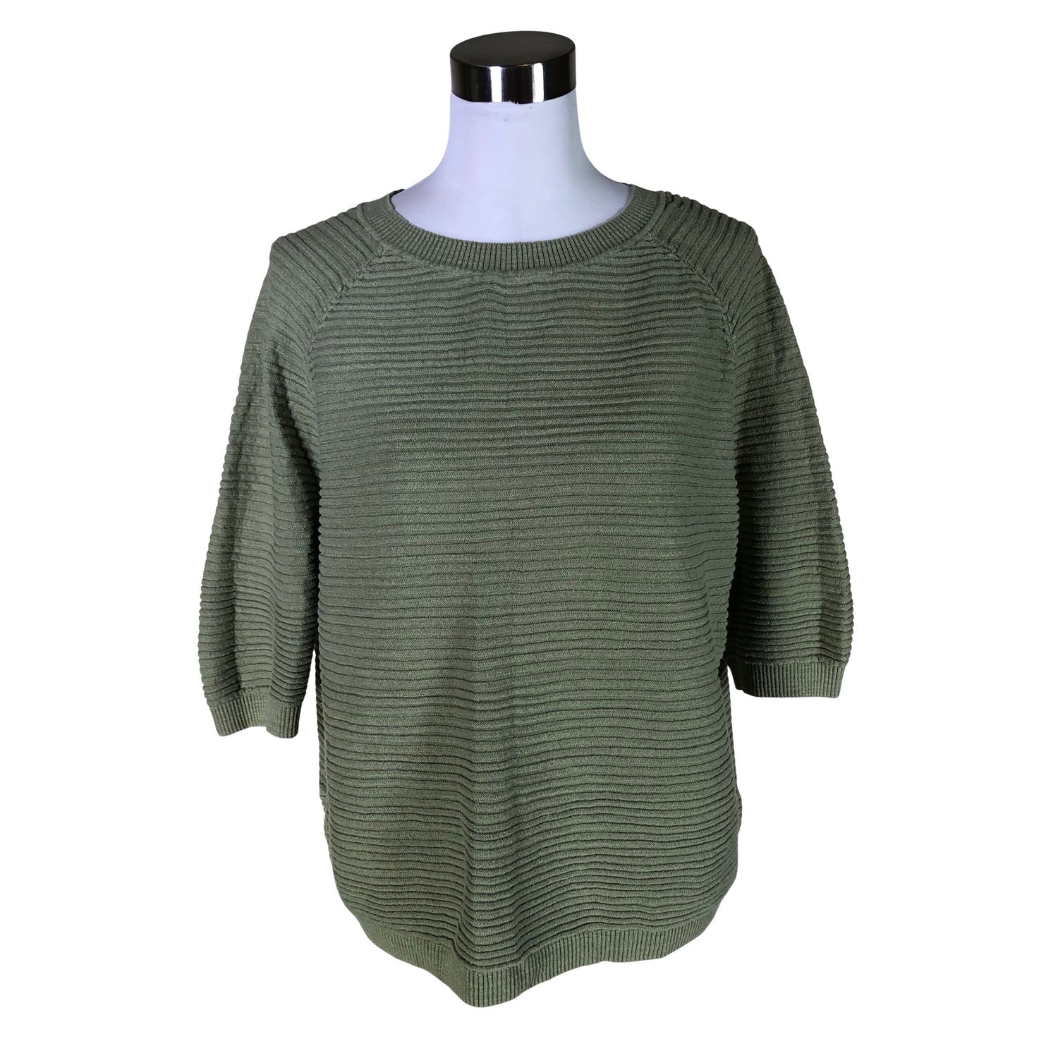 Ribbineulosta. Vajaamittaiset hihat. Materiaali joustaa. Tuotteen pinnassa on hieman pesu-/käyttökulumaa. Yleisilme on siisti.