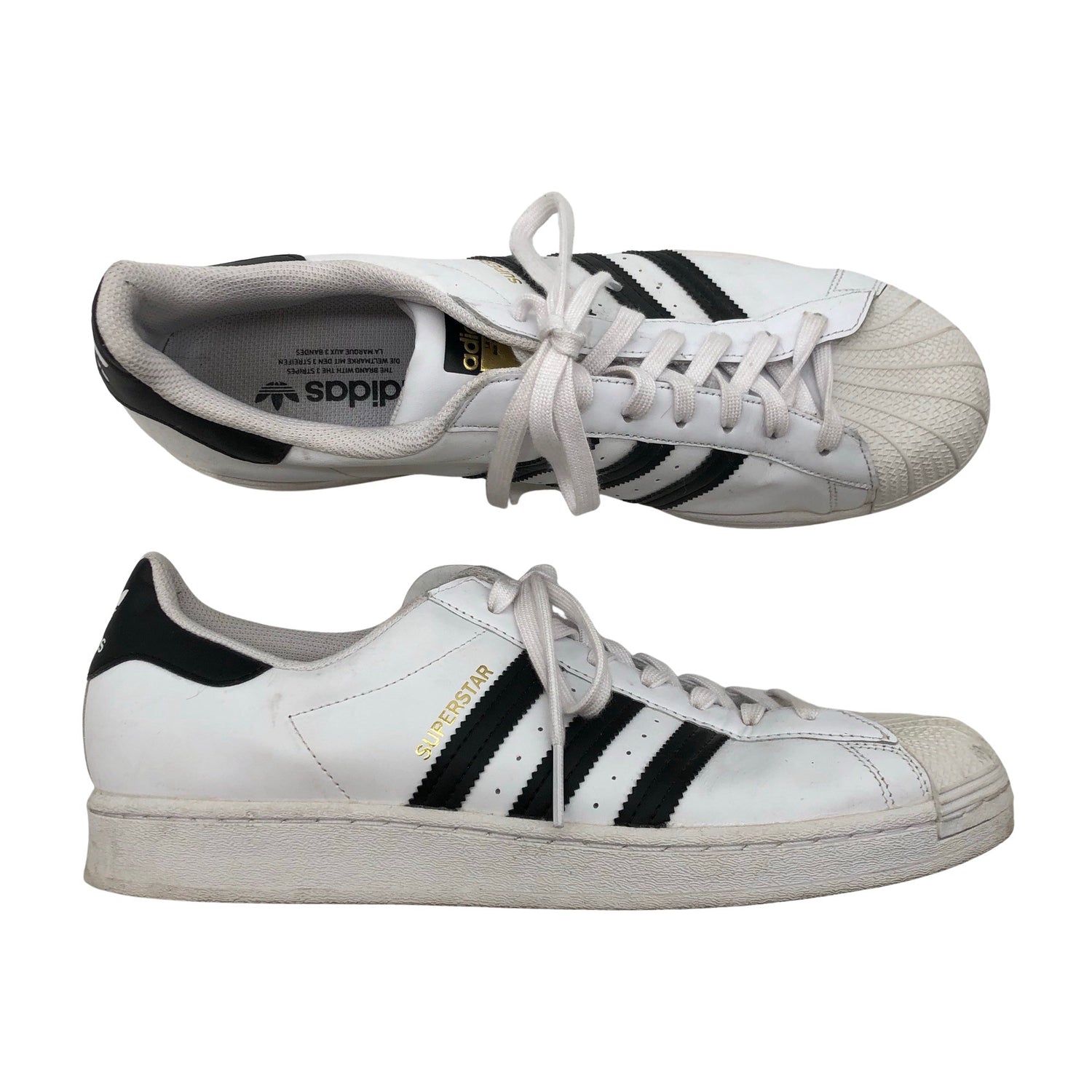 Malli: Superstar. Materiaalitieto puuttuu. Todennäköisesti nahkaa. Solmittava malli. Tuotteen pinnassa on aavistus käyttölikaa. Lähtee todennäköisesti pesussa. Tuote on muilta osin hyvässä kunnossa.