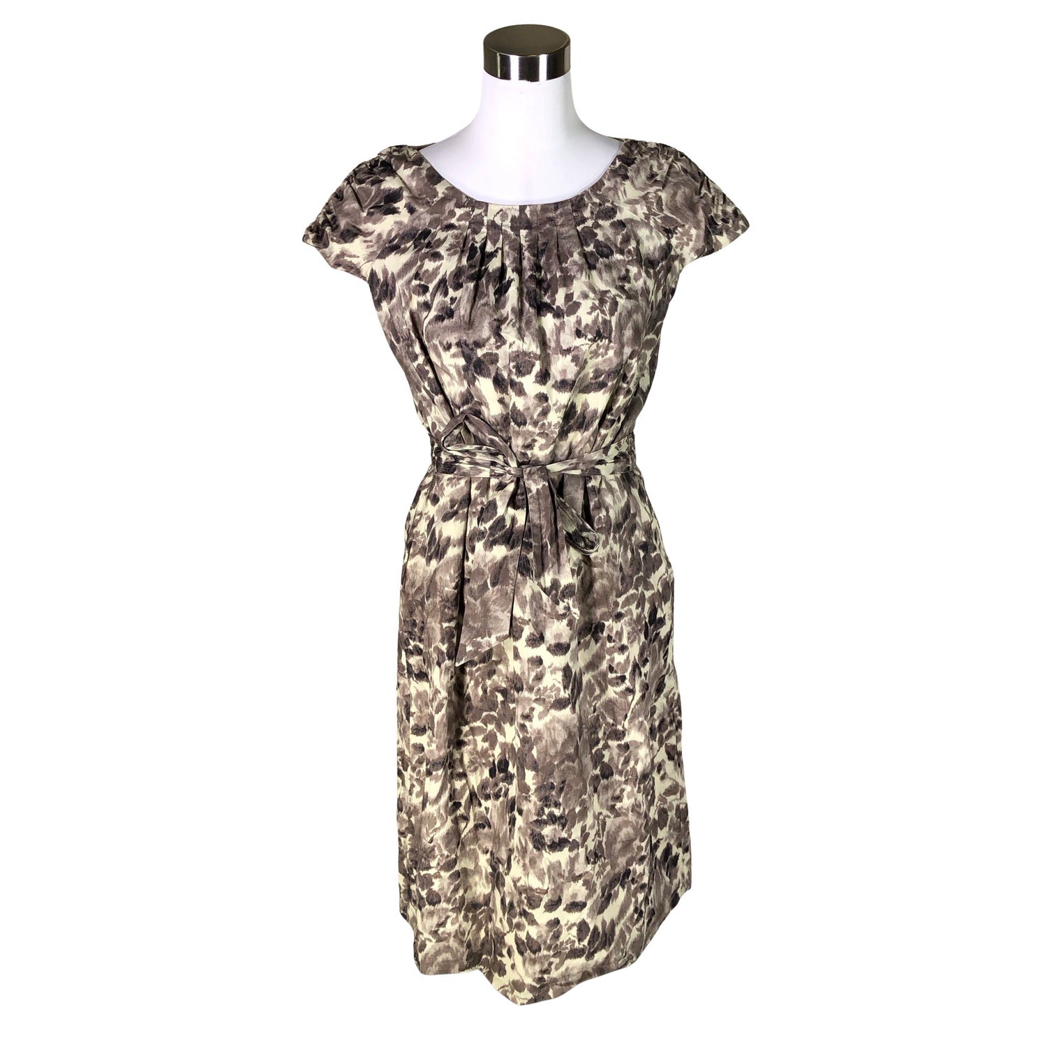Puuvillaa. Tuotteessa on ohut vuori. Tuotteeseen kuuluu vyö. Tuotteen pinnassa on aavistus tummentumaa. Tuotteen pinnassa on aavistus pesu-/käyttökulumaa. Yleisilme on siisti.