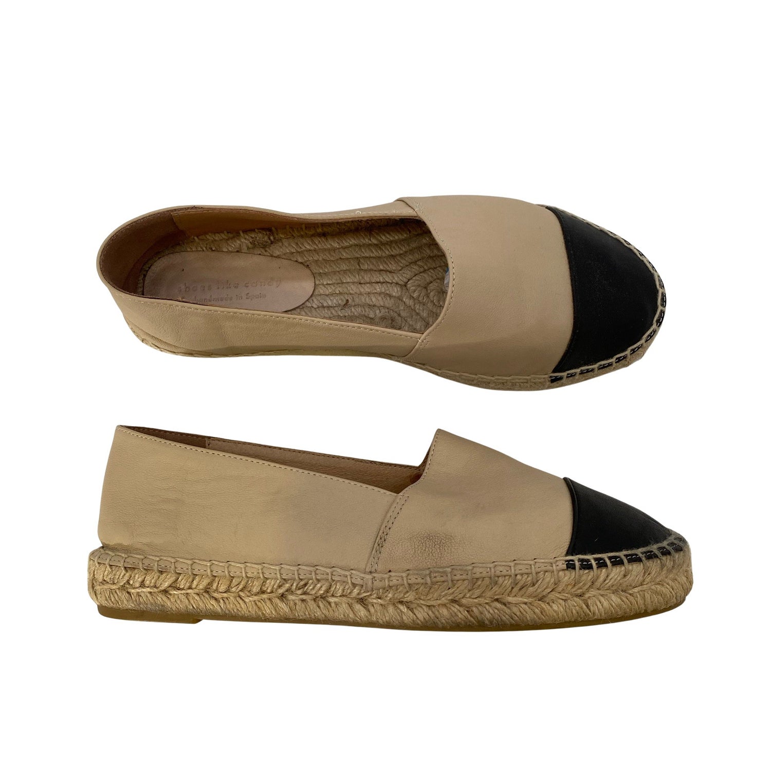 Espadrillot. Materiaalitieto puuttuu. Todennäköisesti nahkaa. Tuotteen sisäpuolella on muutama haalea tahra. Tuote on muilta osin hyvässä kunnossa.