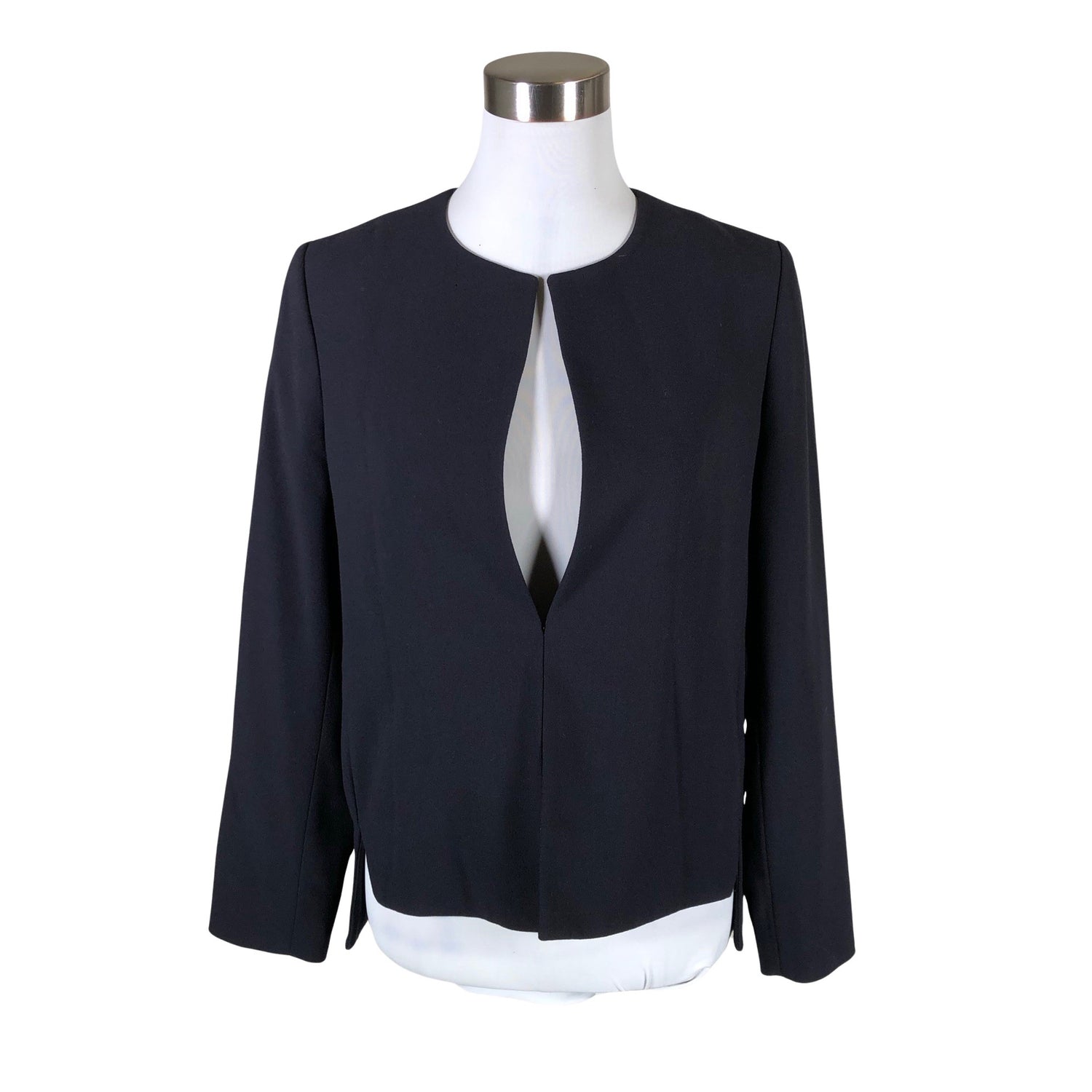 Väljä malli. Tuotteessa on ohut vuori. Epäsymmetrinen helma. Sivusaumoissa on halkiot. Kauluksessa on aavistus kulumaa. Yleisilme on siisti.