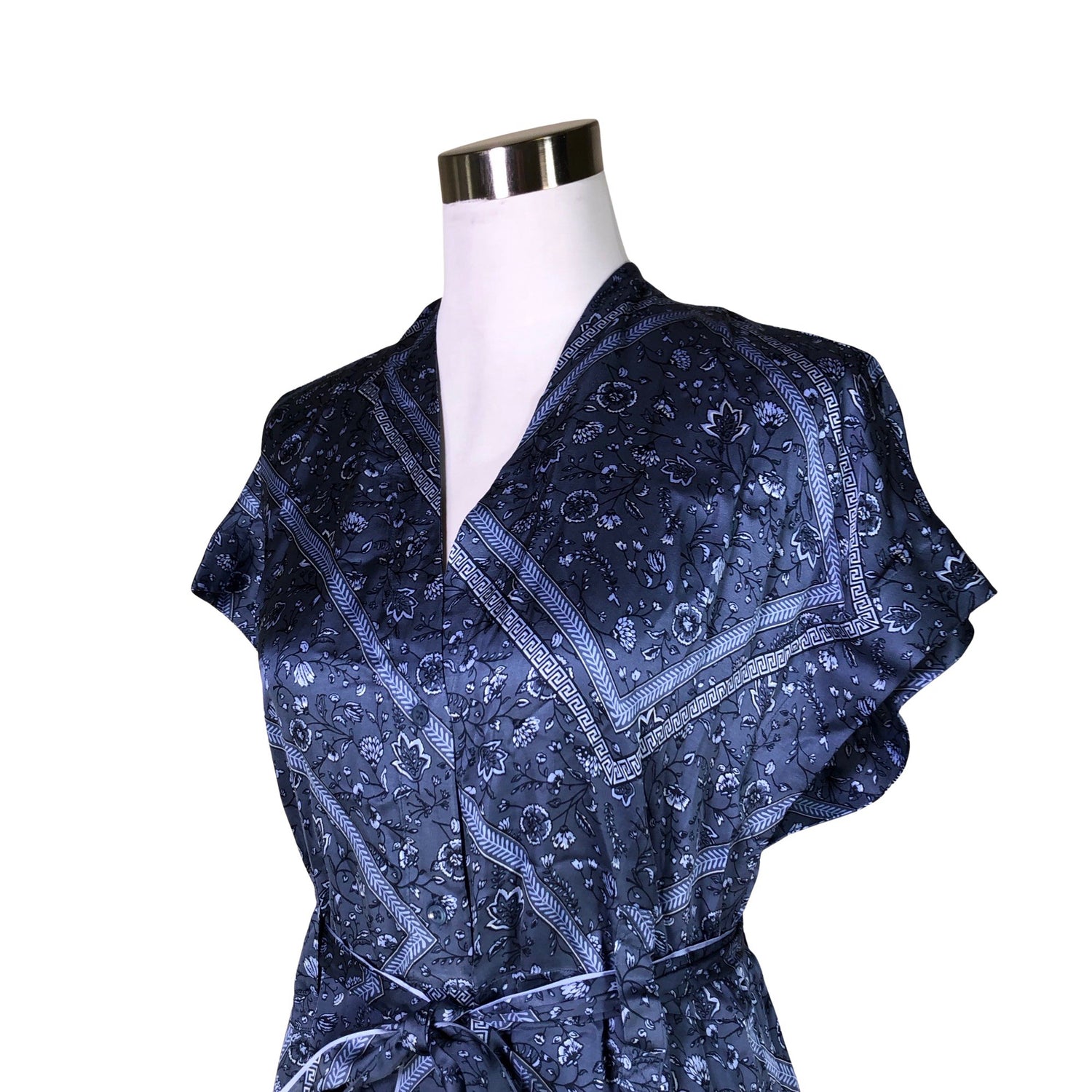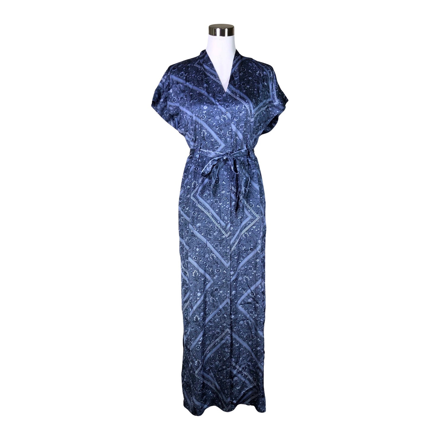 Satiinia. Viskoosia. Langassa on kiiltoa. Laskeutuvaa materiaalia. Edessä napit. Sivusaumoissa on halkiot. Tuotteeseen kuuluu vyö. Materiaali ei jousta.