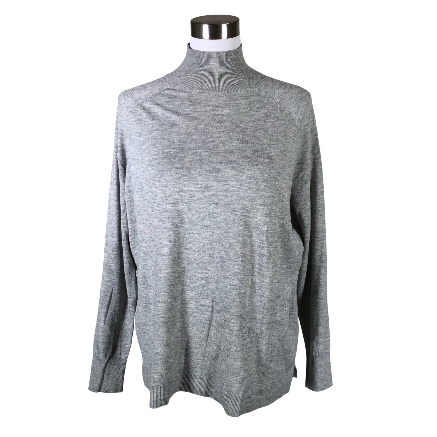 Korkea kaulus. Väljä malli. Materiaali joustaa. Sivusaumoissa on halkiot.