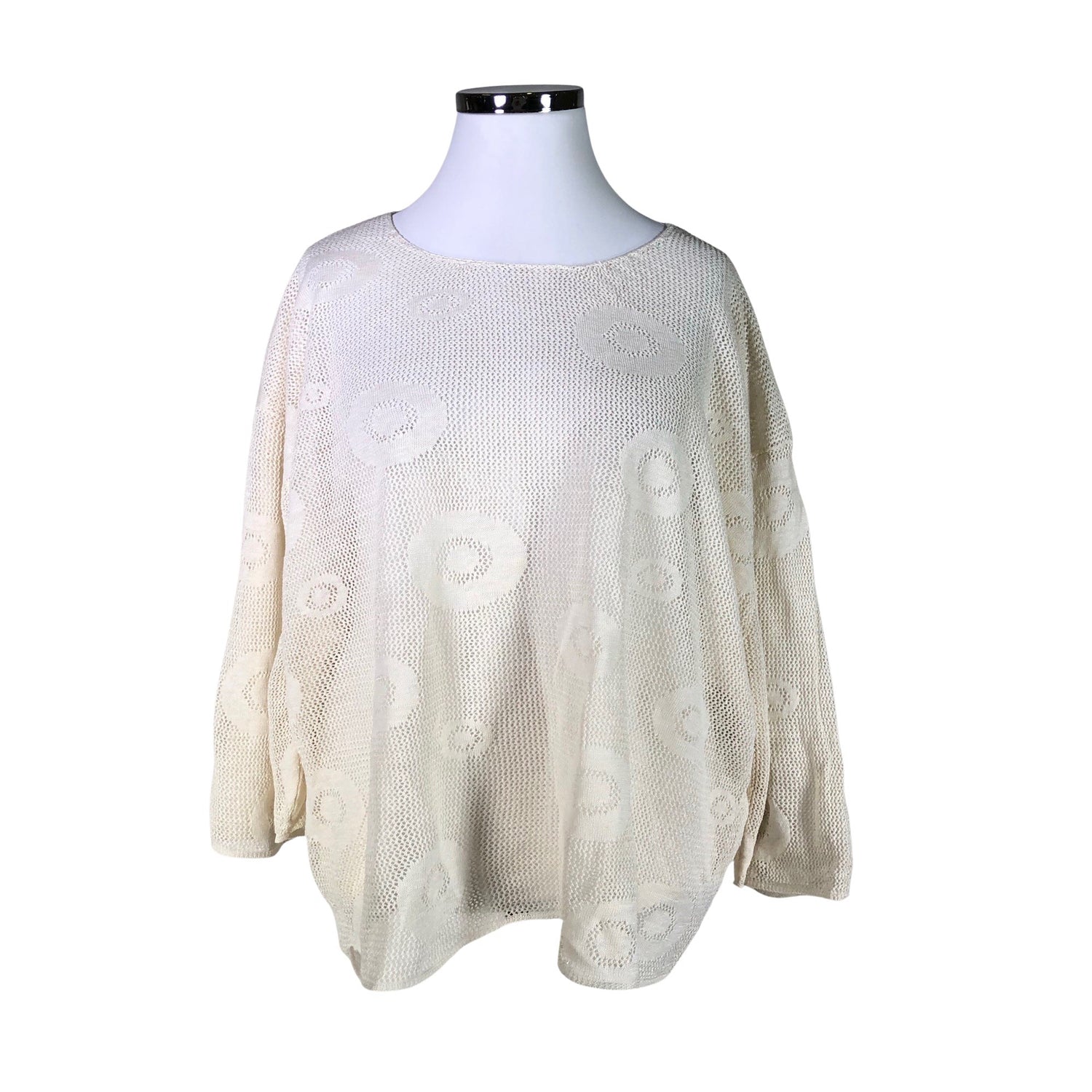 Väljä malli. Ohutta neulosta. Harvaa neulosta. Pellavaa. Vajaamittaiset hihat.