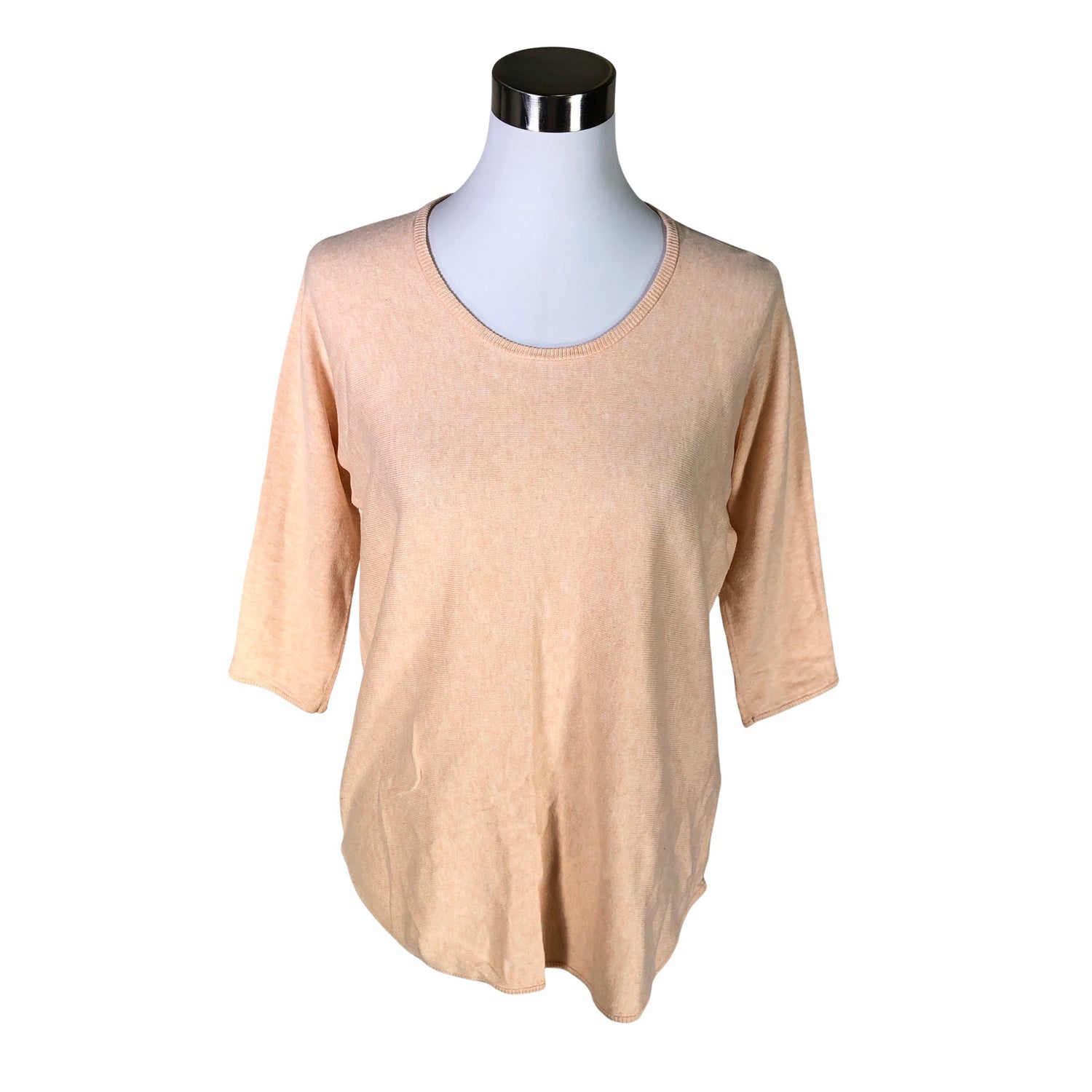Puuvillasekoitetta. Materiaali joustaa. Väri: persikka. Tuotteen pinnassa on aavistus pesu-/käyttökulumaa. Tuotteen pinnassa on aavistus tummentumaa. Yleisilme on siisti.