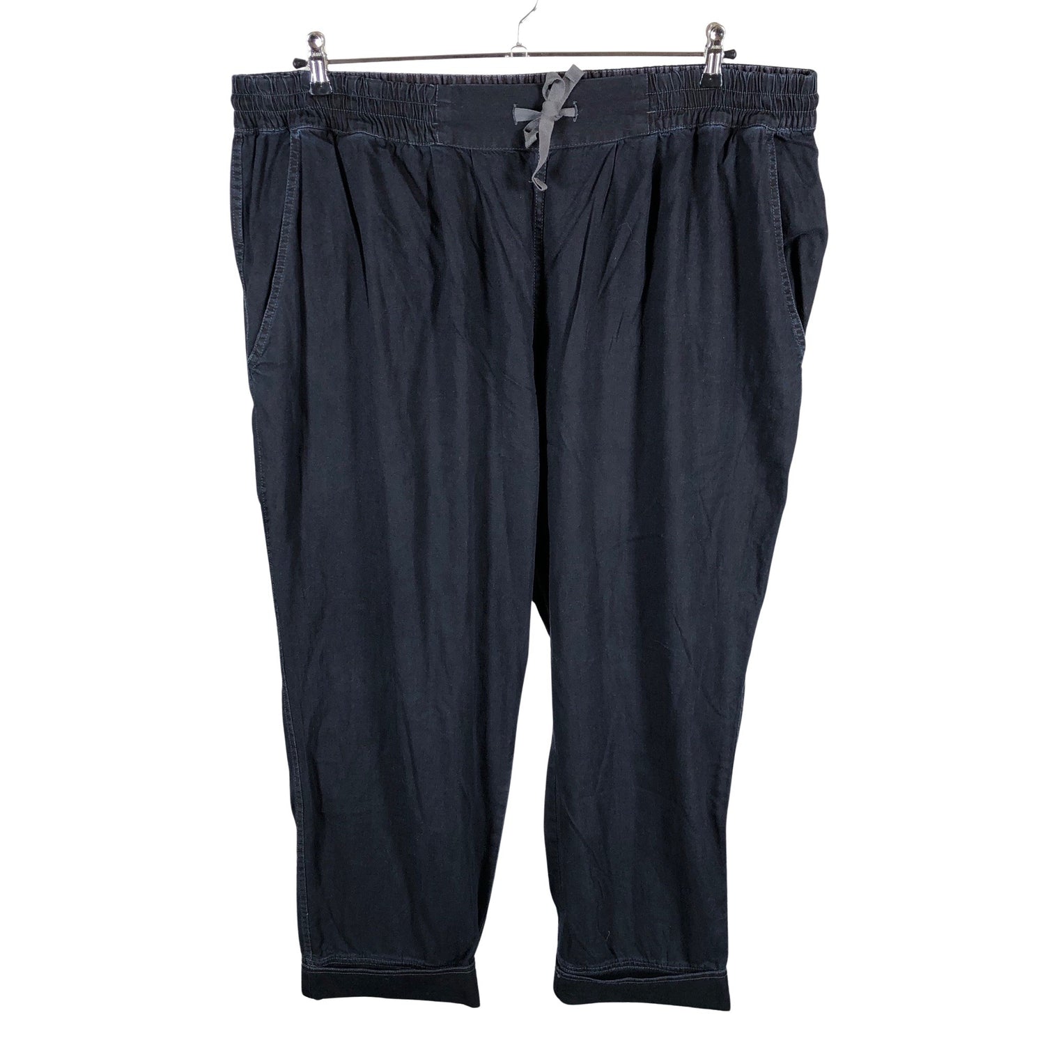 Joustava vyötärö. Vaatteessa on taskut. Tuotteen pinta on hieman haalistunut. Tuotteen pinnassa on hieman pesu-/käyttökulumaa. Yleisilme on siisti.