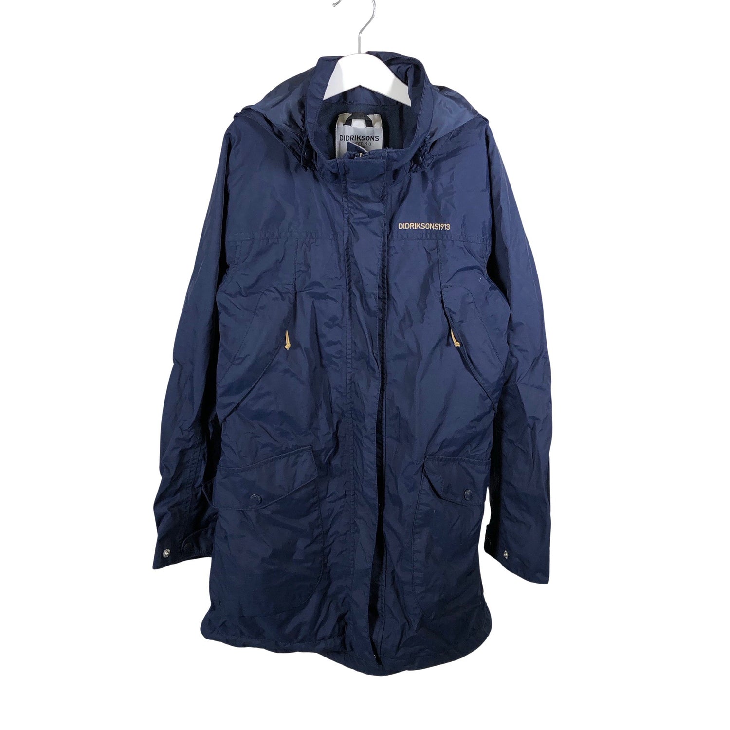 Irrotettava huppu. Vaatteessa on taskut. Tuotteessa on kaksisuuntainen vetoketju. Malli: Thelma Gs Jacket. Tuotteen pinnassa on hieman pesu-/käyttökulumaa. Tuotteen pinnassa on aavistus tummentumaa. Yleisilme on siisti.