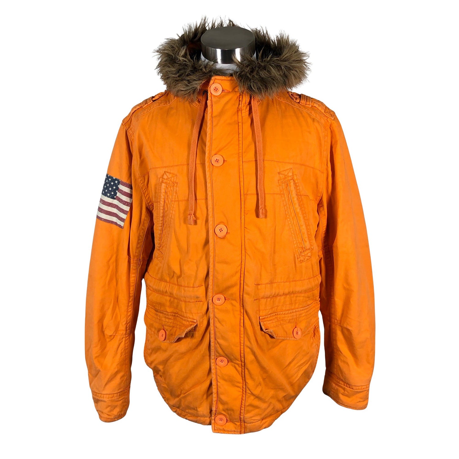Tuotteessa on huppu. Kiristysnauha vyötäröllä. Tuotteen pinnassa on pesu-/käyttökulumaa. Tuotteen pinnassa on muutama tahra. Yleisilme on siisti.