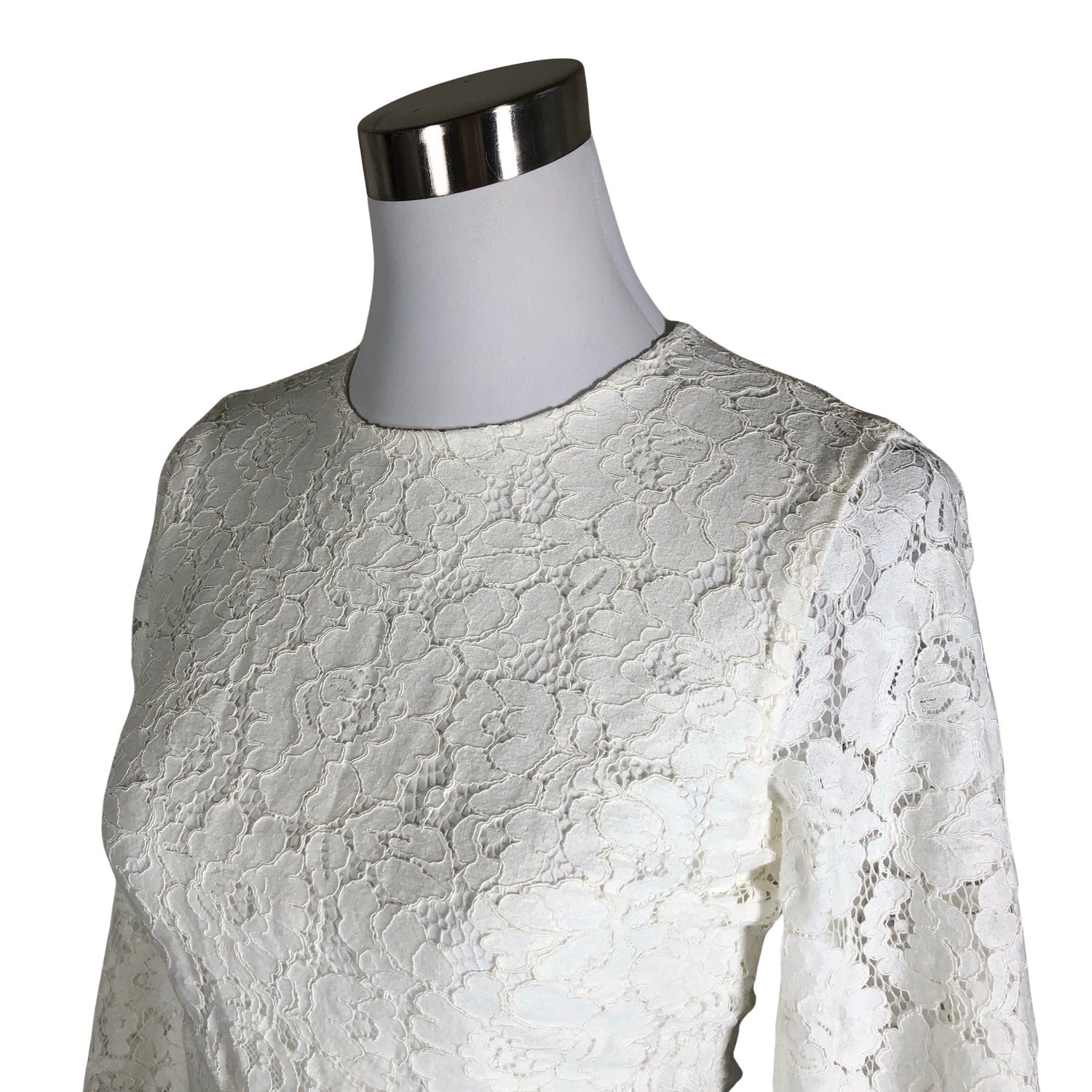 Hääpuku. Tuote on osin pitsiä. Tuotteessa on vuori. Vetoketju takana. Laskeutuvaa materiaalia.