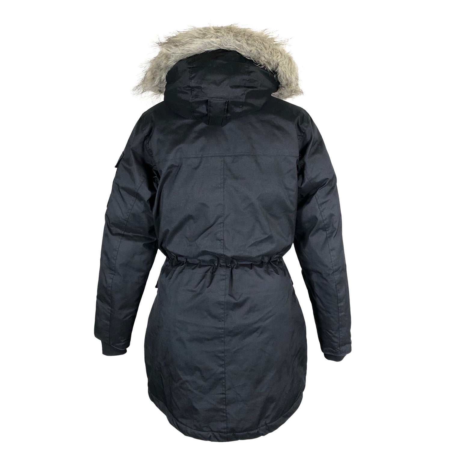 Parkatakki. Tuotteessa on huppu. Irrotettava karvakaulus. Kiristysnauha vyötäröllä.