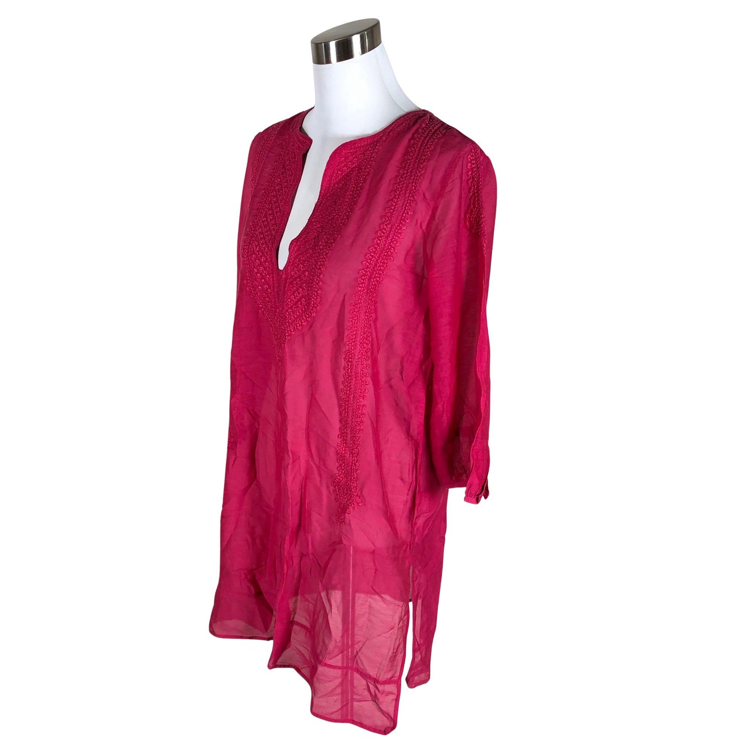 Silkkisekoitetta. Sivusaumoissa on halkiot. Läpikuultavaa materiaalia. Kirjailtu. Materiaali ei jousta. Tuotteen pinnassa on hieman pesu-/käyttökulumaa. Yleisilme on siisti.