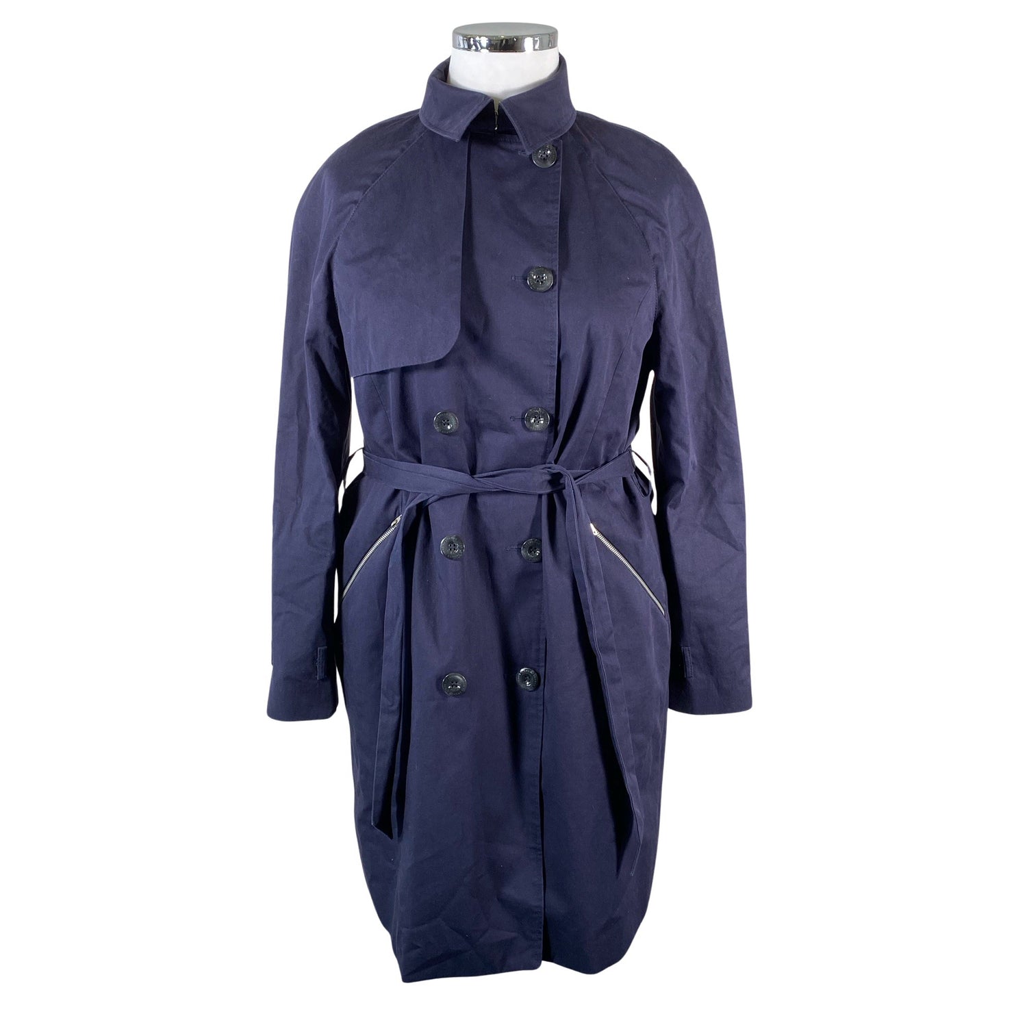 Olkatoppaukset. Tuotteeseen kuuluu vyö. Kauluksen sisäpuolella on aavistus tummentumaa. Tuotteen pinnassa on aavistus pesu-/käyttökulumaa. Yleisilme on siisti.