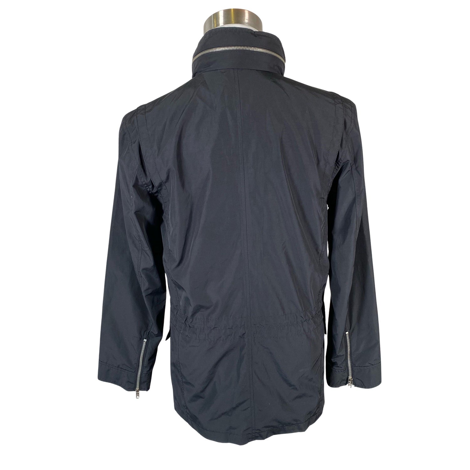 Tuotteessa on piilotettava huppu. Tuotteessa on ohut vuori. Kiristysnauha vyötäröllä. Hihoissa on vetoketjut. Tuotteen pinnassa on hieman pesu-/käyttökulumaa. Kauluksen sisäpuolella on hieman tummentumaa. Yleisilme on siisti.
