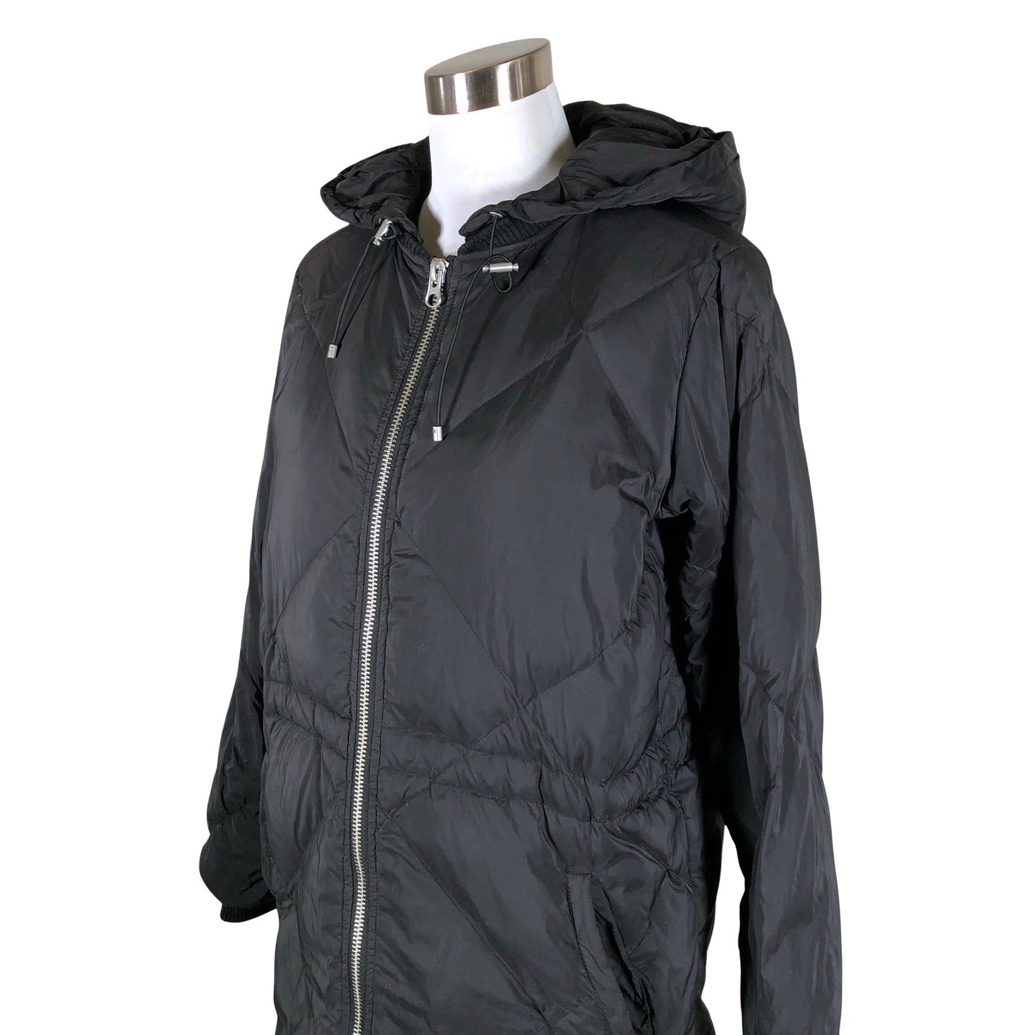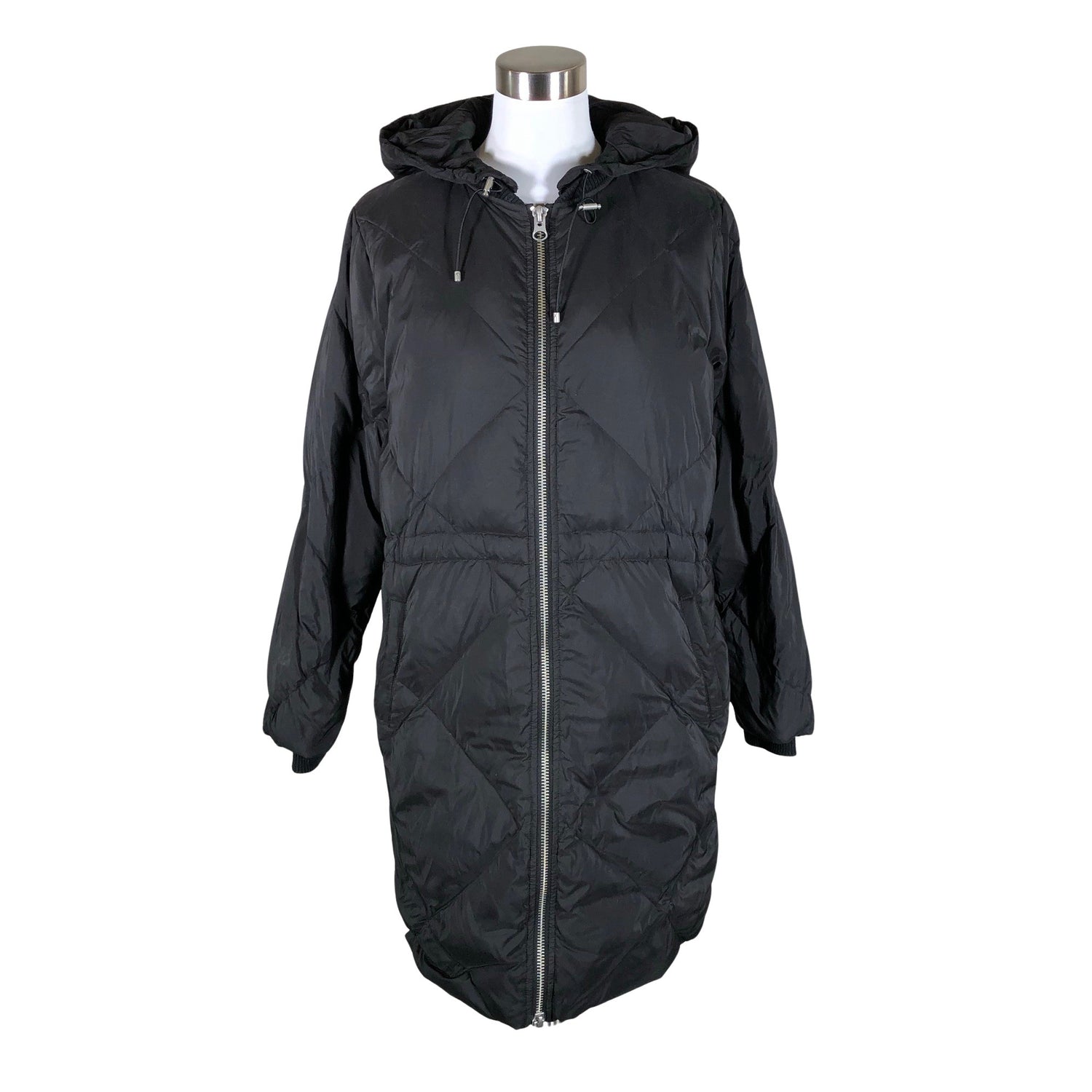 Sh# 279,95 €. Malli: Sade down zip coat. Kiristysnauha vyötäröllä. Irrotettava huppu. Resoreissa on aavistus nukkaa/kulumaa. Yleisilme on siisti.