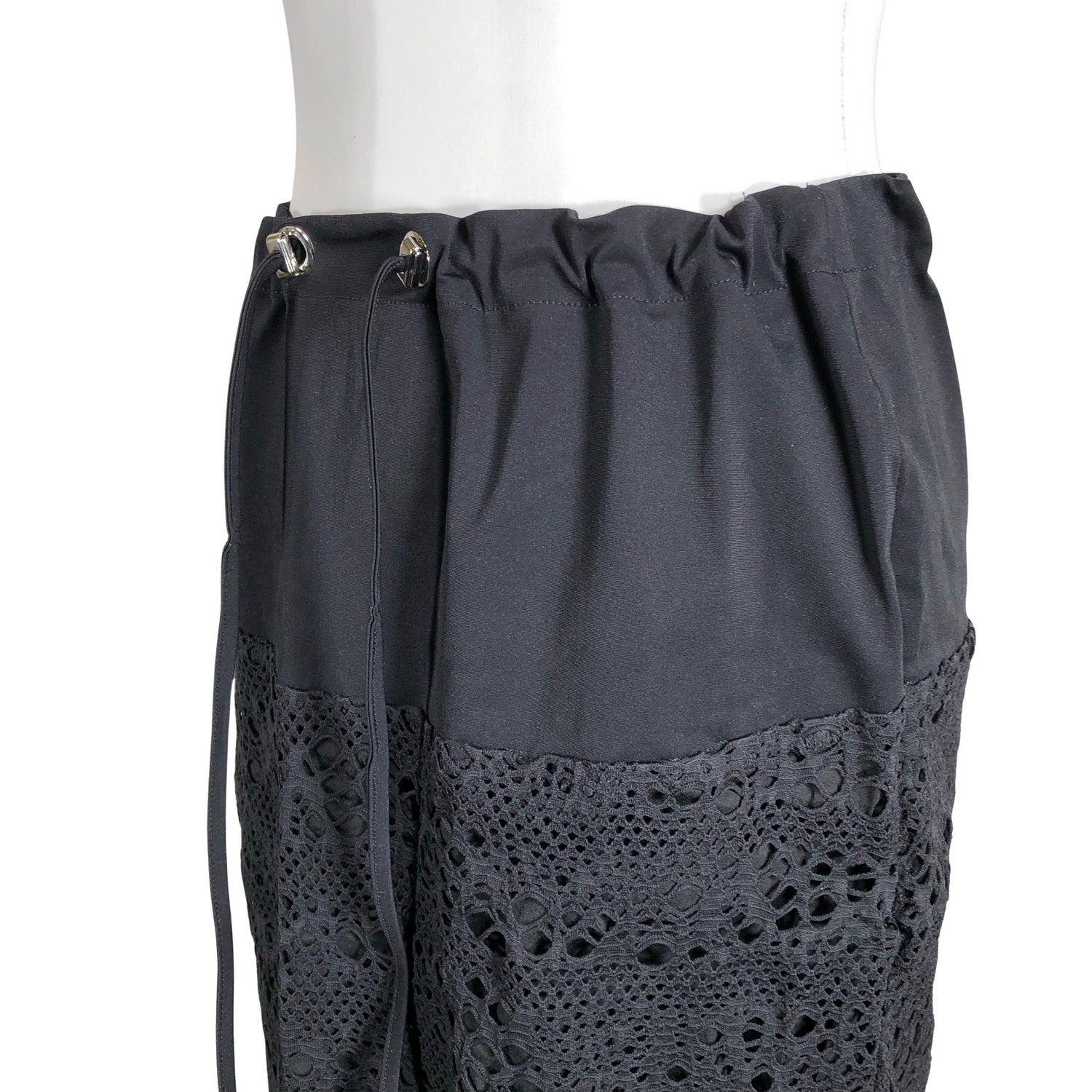 Kiristysnauha vyötäröllä. Materiaali joustaa hieman. Tuote on osin pitsiä.