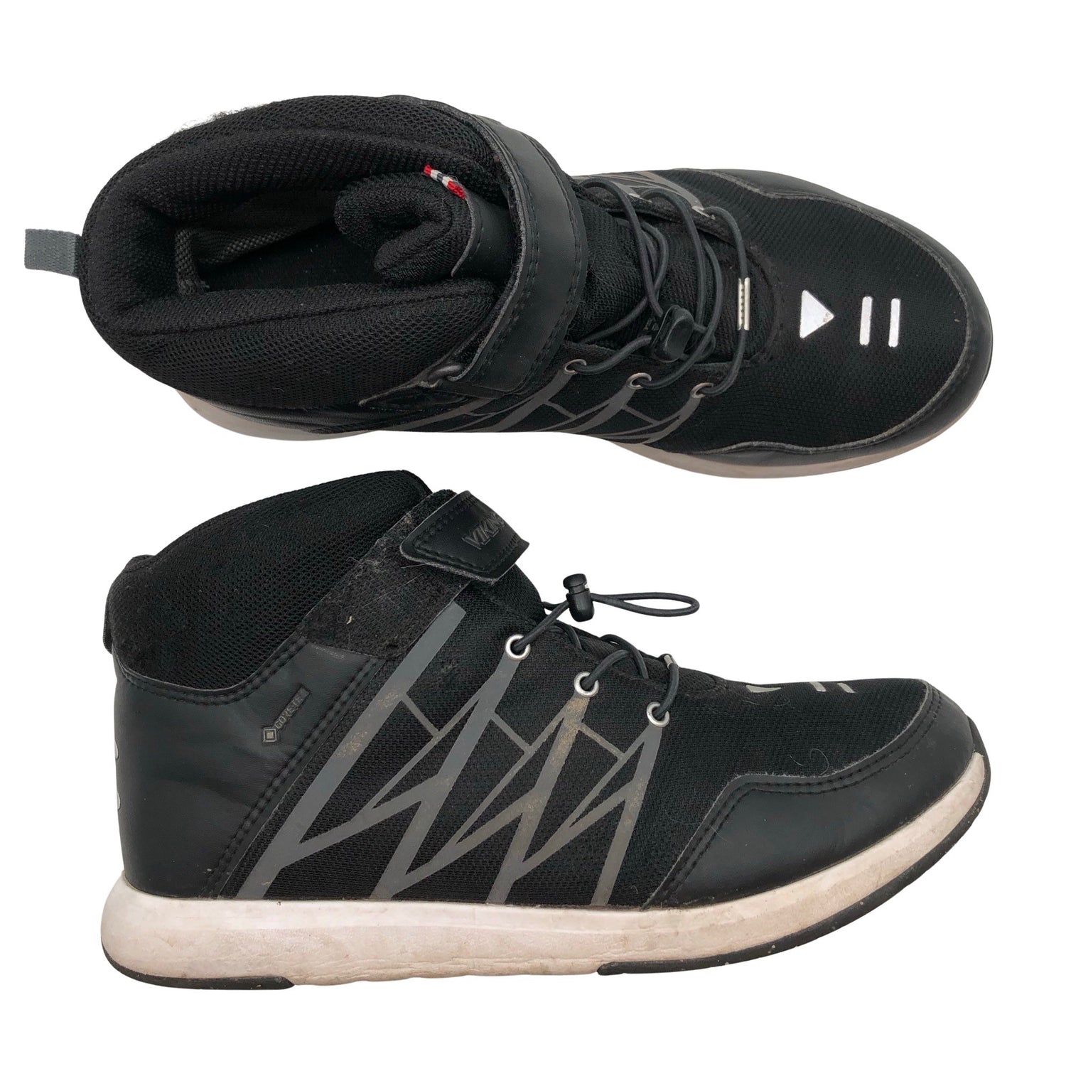 Tuotteessa on tarrakiinnitys. Joustavat kengännauhat. Gore-Tex -merkintä. Tuotteen pinnassa on hieman pesu-/käyttökulumaa. Yleisilme on siisti.