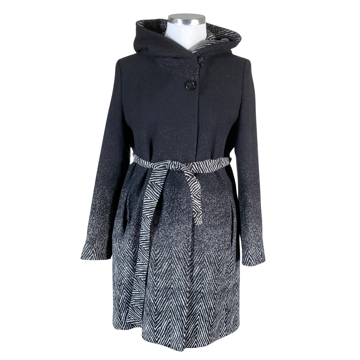 Tuotteessa on huppu. Tuotteessa on ohut vuori. Tuotteeseen kuuluu vyö. Piilonapitus. Tuotteen pinnassa on hieman pesu-/käyttökulumaa. Yleisilme on siisti.