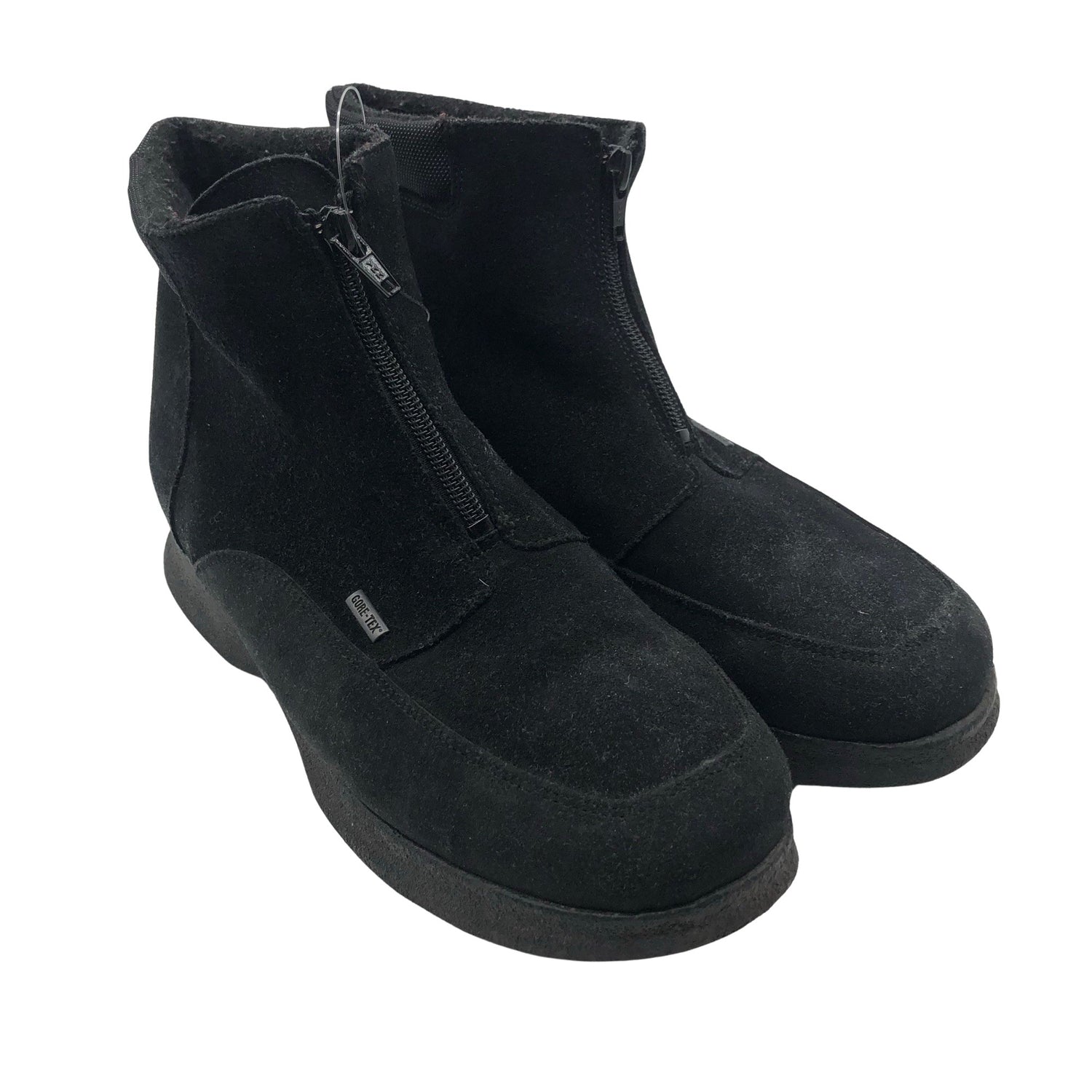 Gore-Tex -merkintä. Materiaalitieto puuttuu. Todennäköisesti nahkaa. Mokkanahkaa. Tuotteen sisäpuolella on hieman nukkaa. Tuotteen sisäpuolella on hieman kulumaa. Tuotteen pinnassa on aavistus pesu-/käyttökulumaa. Yleisilme on siisti.