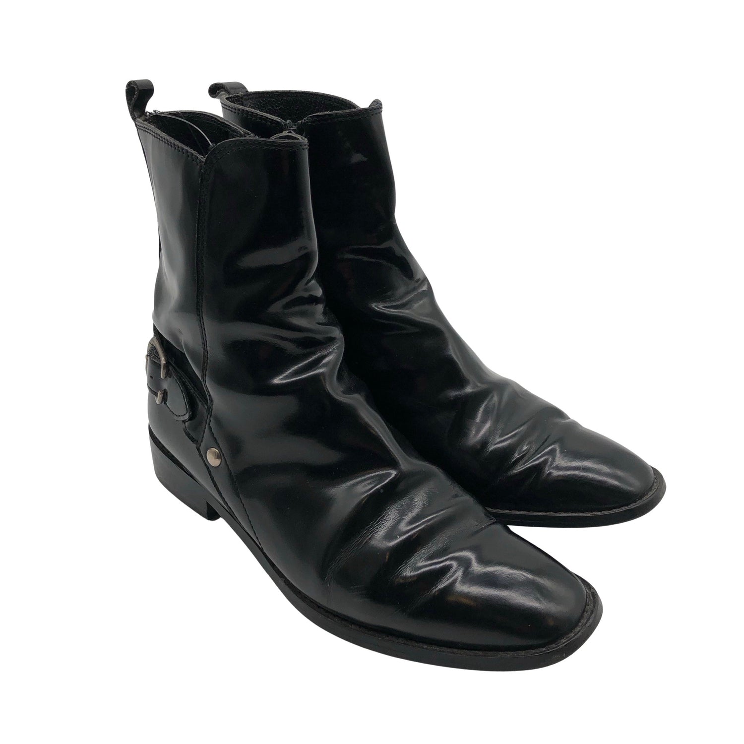 Tuotteen pinta on kiiltävä. Materiaalitieto puuttuu. Todennäköisesti nahkaa. Tuotteessa on vetoketju. Tuotteen pinnassa on hieman pesu-/käyttökulumaa. Yleisilme on siisti.