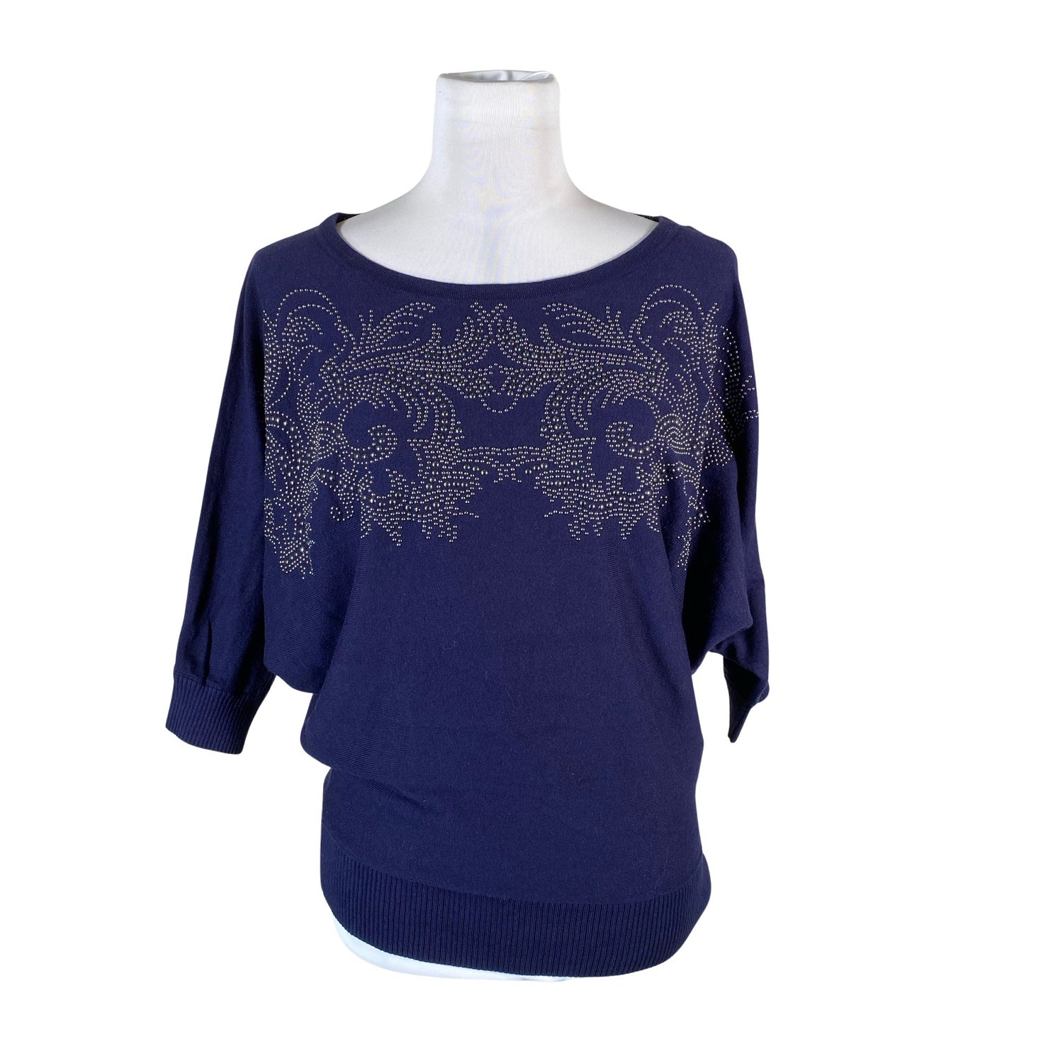 Lepakkomalliset hihat. Tuotteen pinnassa on kimalletta. Ohutta neulosta. Materiaali joustaa. Tuotteen pinnassa on hieman pesu-/käyttökulumaa. Yleisilme on siisti.