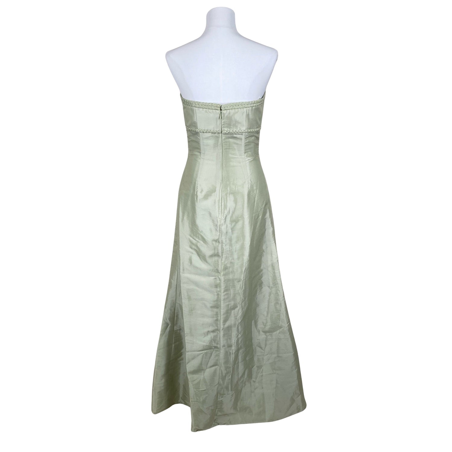 Olkaimeton malli. Vetoketju takana. Langassa on kiiltoa. Tuotteen pinnassa on aavistus pesu-/käyttökulumaa. Yleisilme on siisti.