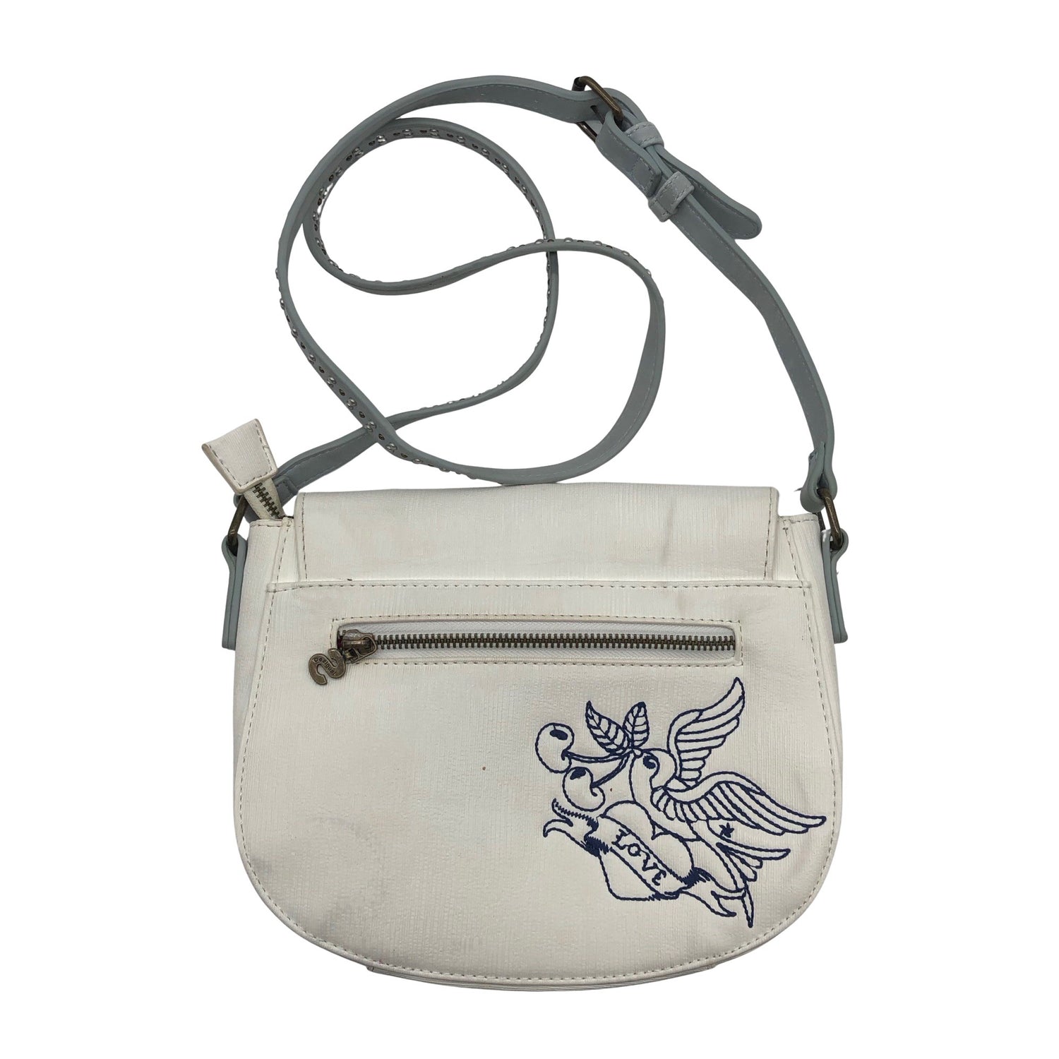 Crossbody. Magneettikiinnitys. Olkahihnan pituus on säädettävissä. Kirjailtu. Tuotteen pinnassa on haalea tahra. Tuotteen sisäpuolella on pieni nirhauma. Tuotteen sisäpuolella on haalea tahra. Yleisilme on siisti.