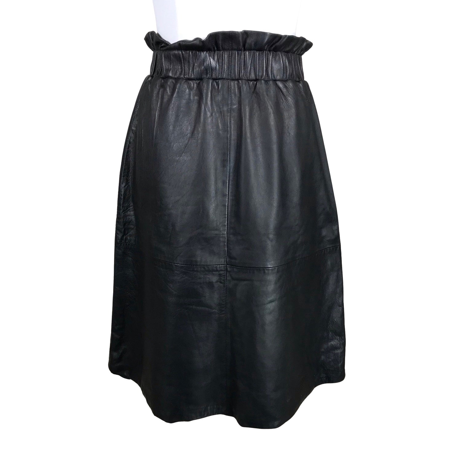 Materiaalitieto puuttuu. Todennäköisesti nahkaa. Joustava vyötärö. Tuotteen pinnassa on haalea tahra. Tuote on muilta osin hyvässä kunnossa.