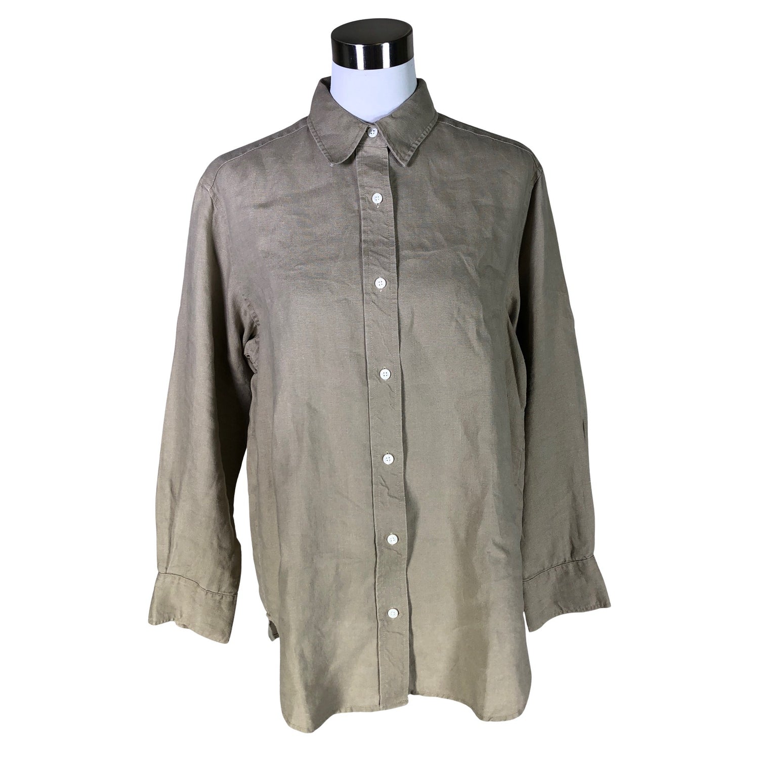 Edessä napit. Materiaali ei jousta. Pellavaa.