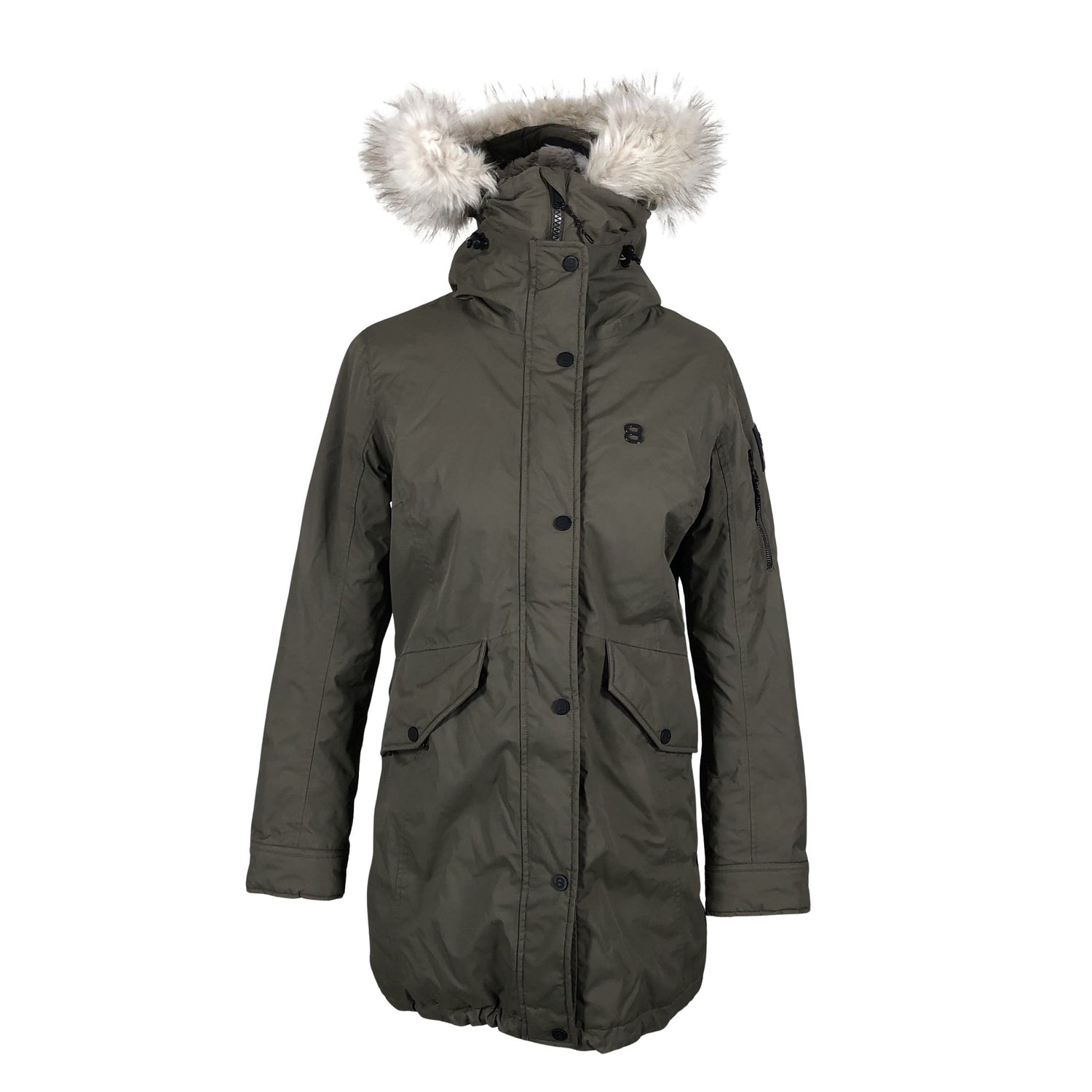 Parkatakki. Tuotteessa on huppu. Irrotettava karvakaulus. Kauluksen sisäpuolella on hieman tummentumaa.