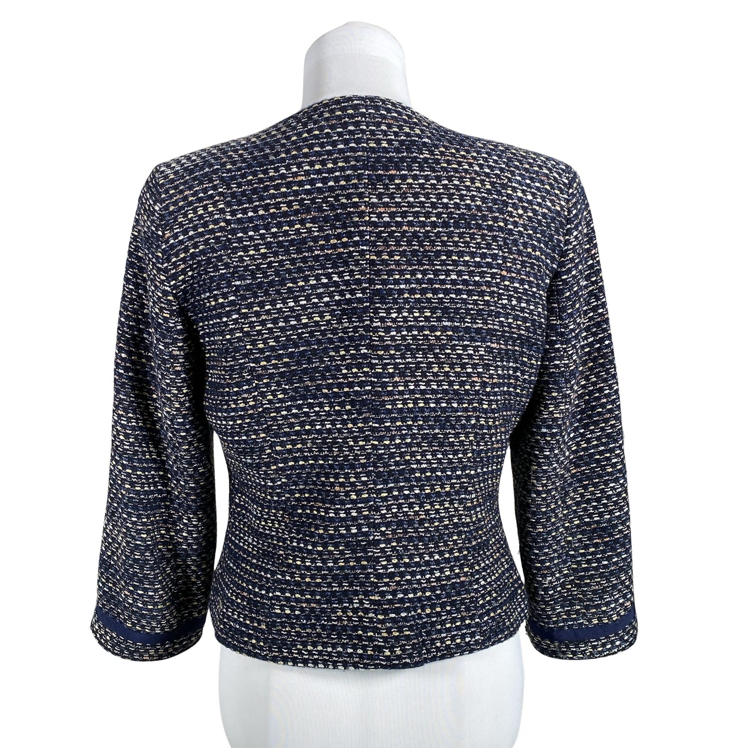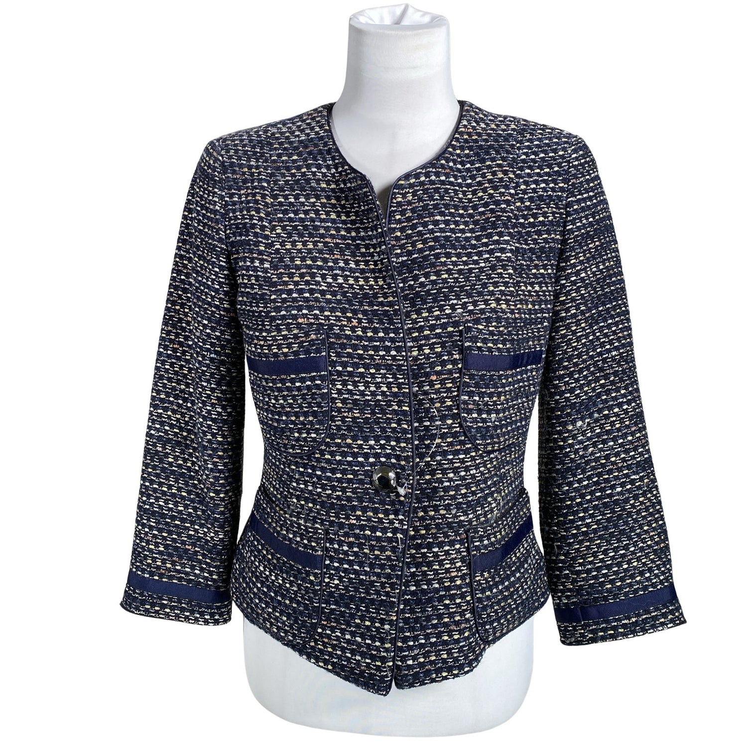 Vajaamittaiset hihat. Eläväpintaista materiaalia. Ei vesipesua/kuivapesu. Kemiallinen pesu. Tuotteen pinnassa on hieman pesu-/käyttökulumaa. Yleisilme on siisti.