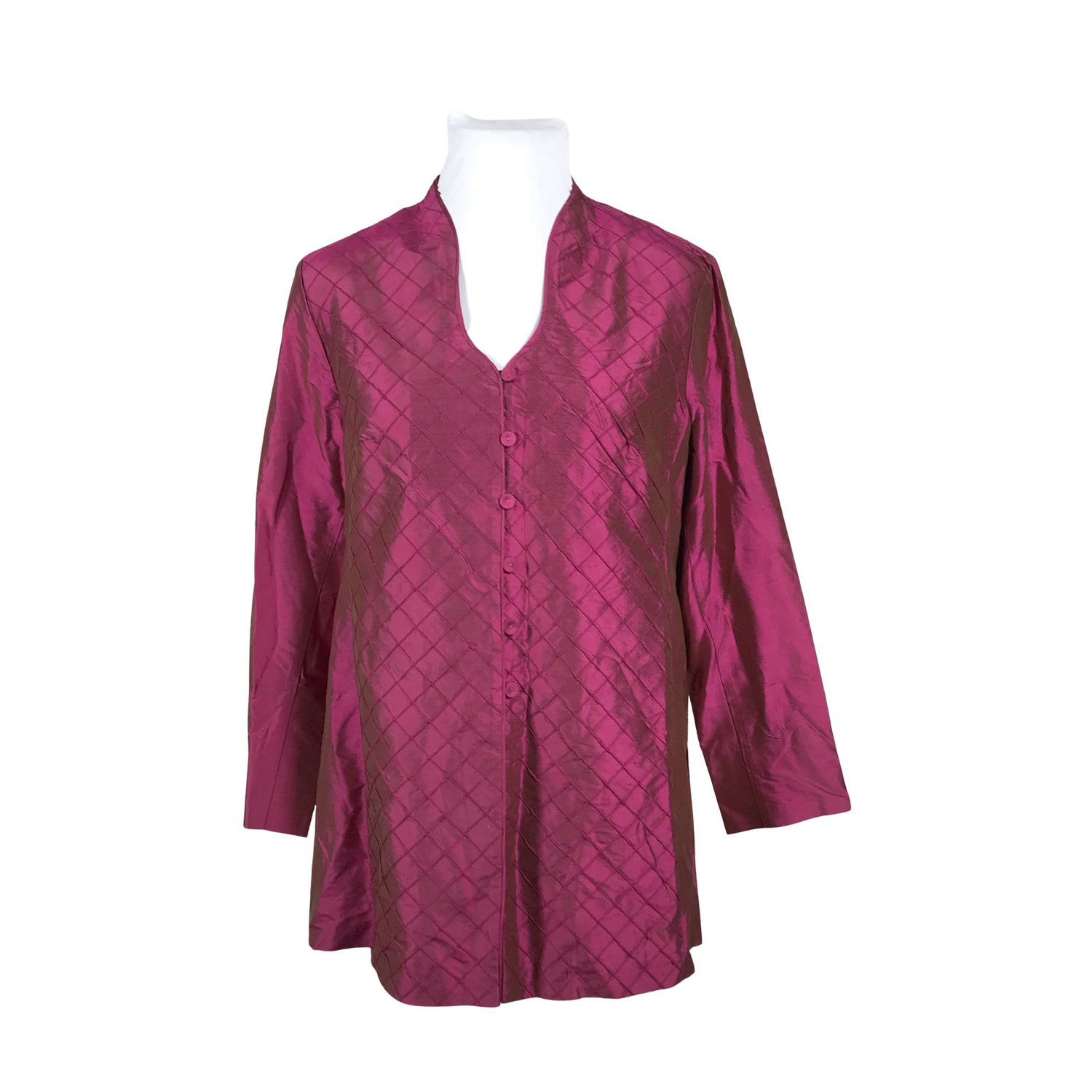 Silkkiä. Pitkä malli. Olkatoppaukset. Edessä napit. Sivusaumoissa on halkiot.