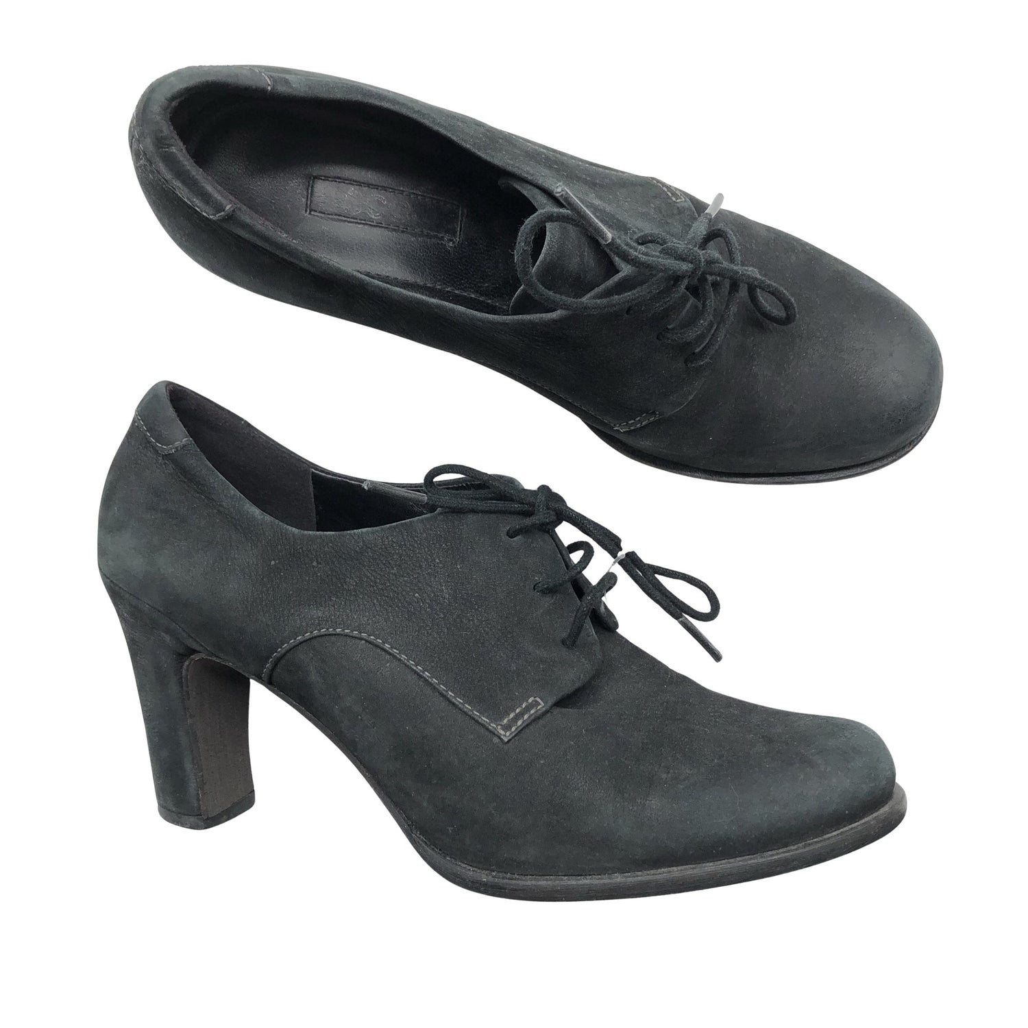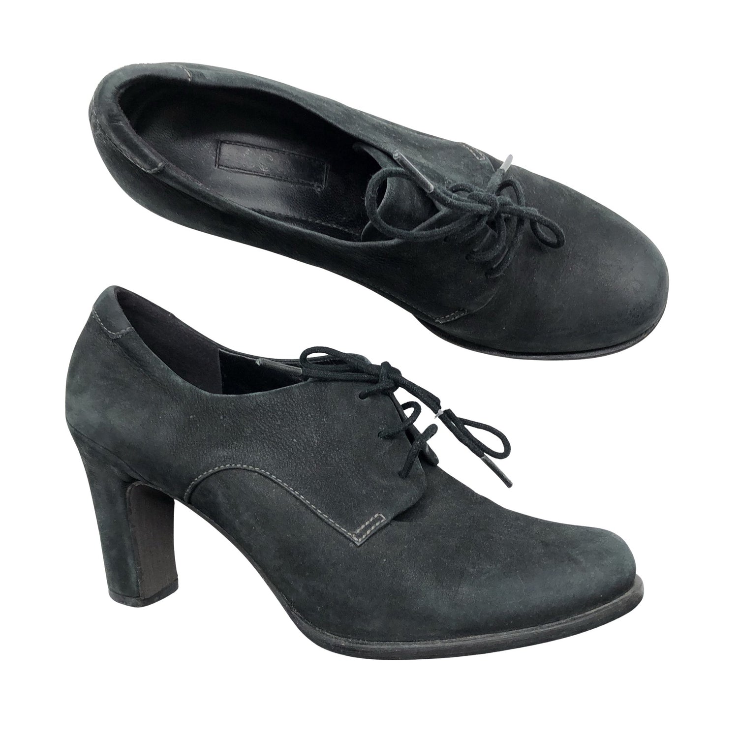 Materiaalitieto puuttuu. Todennäköisesti nahkaa. Kenkien koroissa on hieman kulumaa. Tuotteen pinnassa on aavistus pesu-/käyttökulumaa. Yleisilme on siisti.